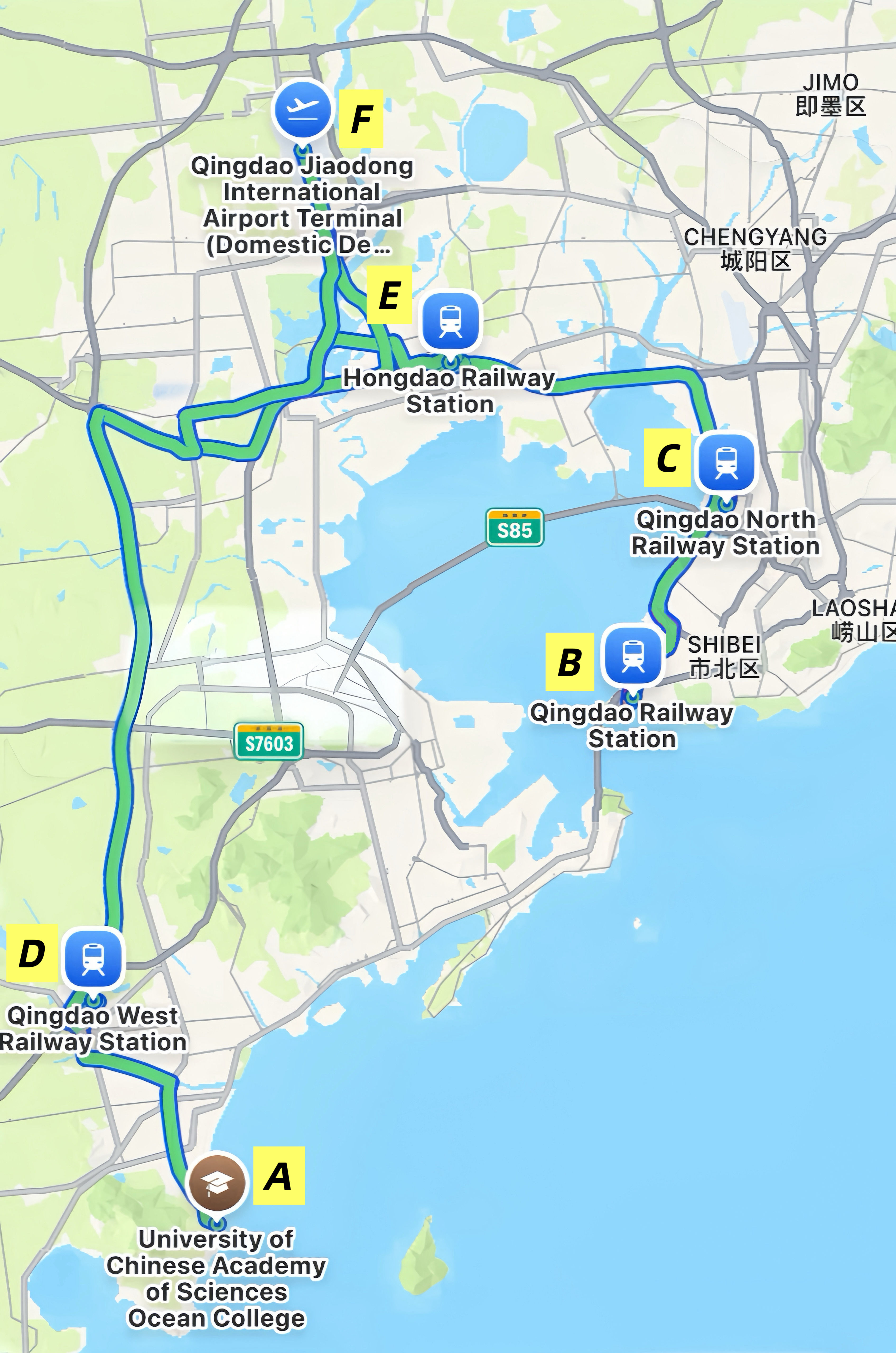 62 km, 100–120 RMB, 1 h 9 min (via Qingdao Jiaozhou Bay Under-sea Tunnel)